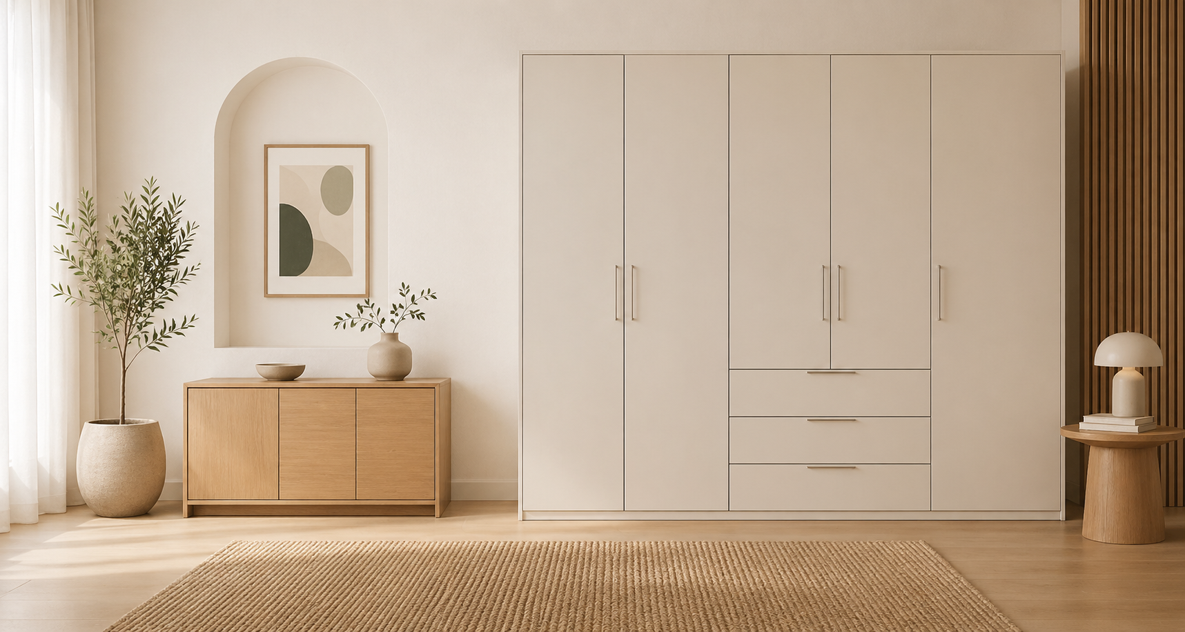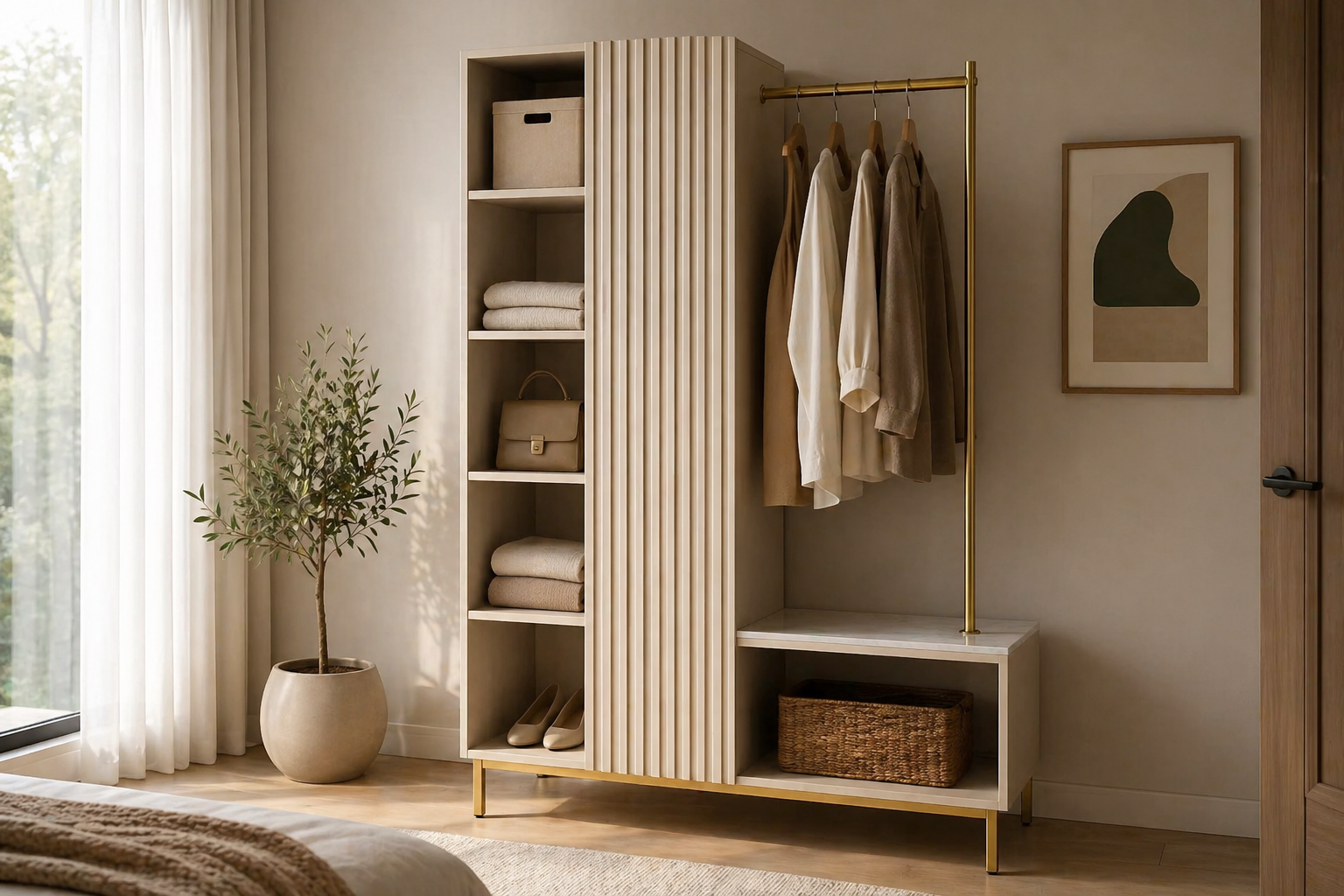 Clean lines and soft beige tones create a refined, modern look. Designed with open shelving and a hanging rail for effortless organization and everyday convenience.
