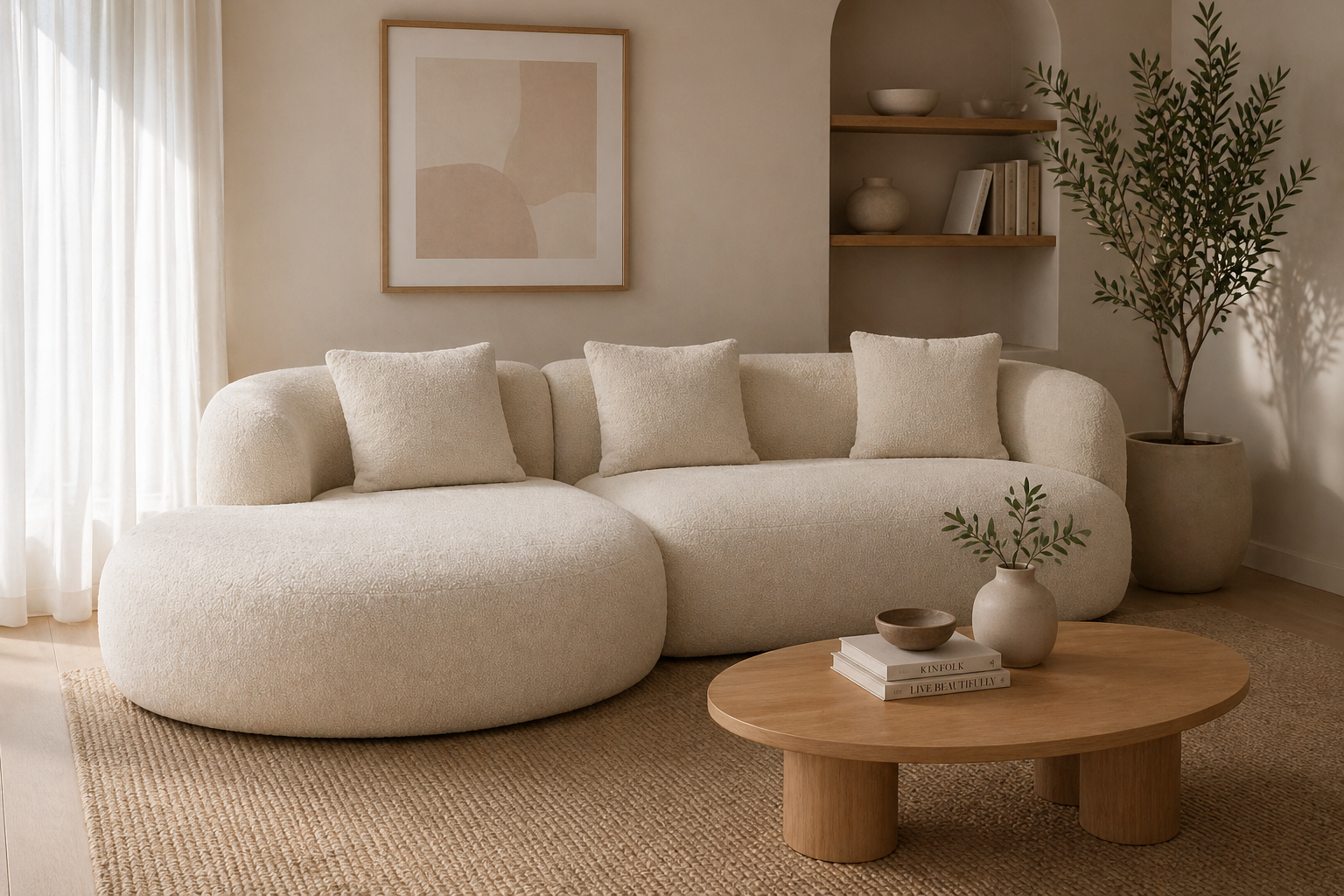 Featuring soft sculptural curves and luxurious bouclé fabric, this sofa brings warmth and refined elegance to any space. Designed for deep comfort and everyday living, it creates a cozy atmosphere perfect for relaxing, entertaining, and unwinding in style.